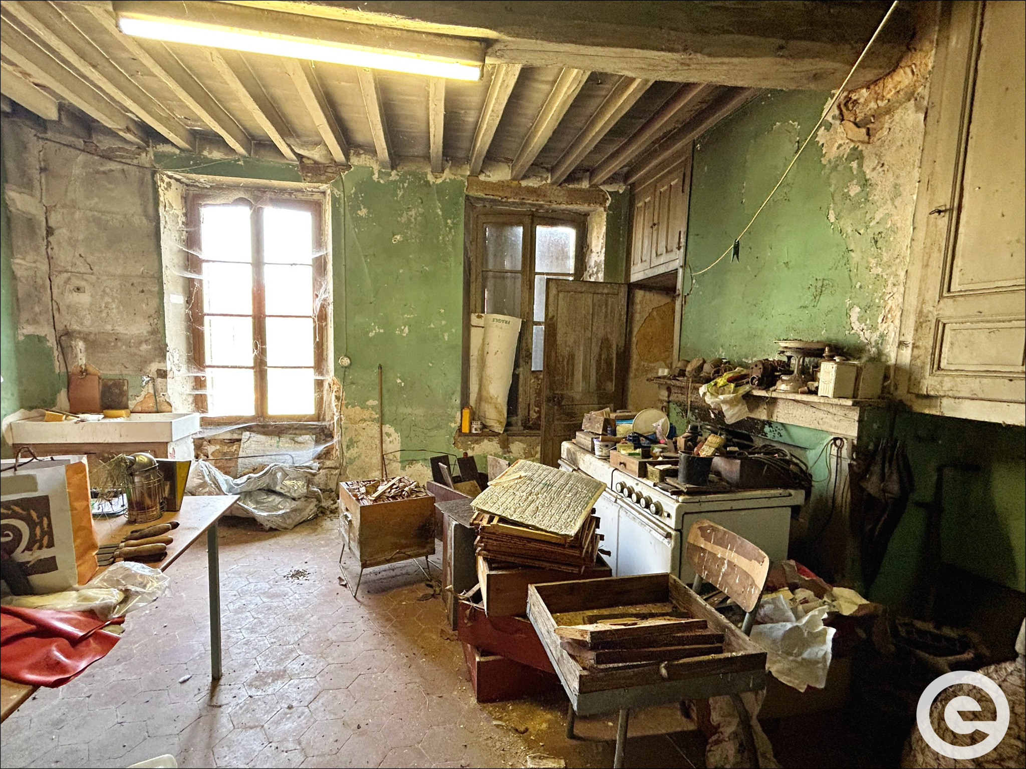 ⚠️ À noter : la maison est à rénover entièrement — absence de sanitaires et de système de chauffage, fenêtres en simple vitrage.