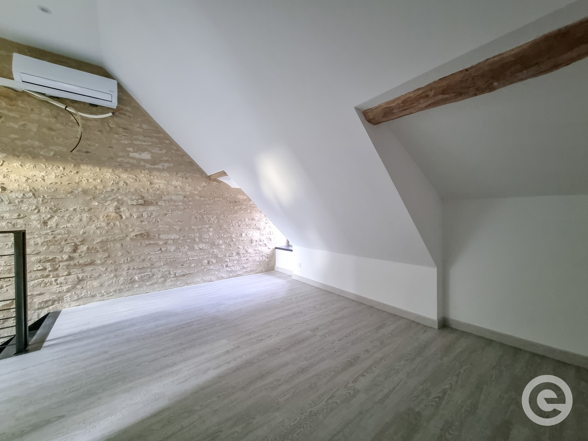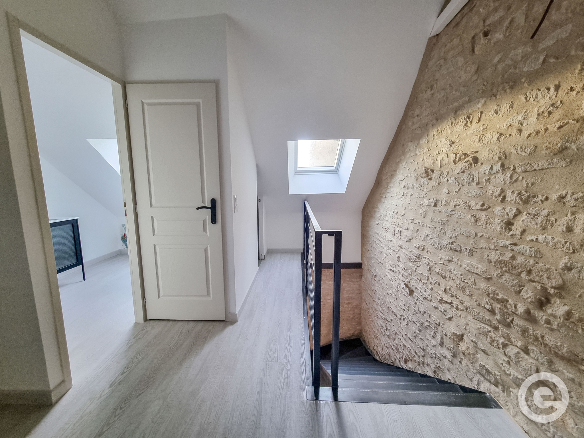 L’étage, accessible par un élégant escalier métallique réalisé par un ferronnier, comprend un coin nuit, une salle d’eau ainsi qu’un WC indépendant.