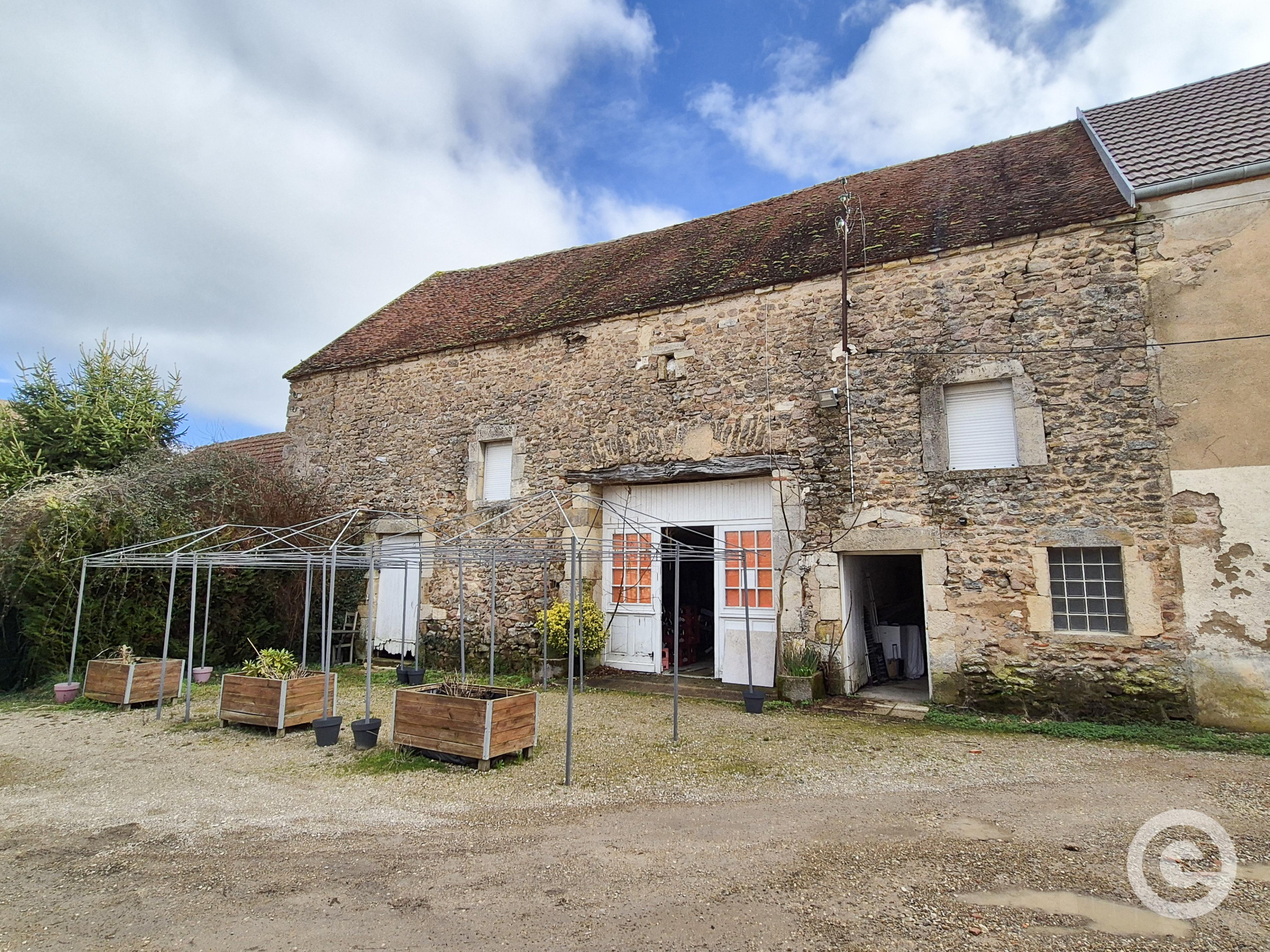 À l’extérieur, une cour intérieure avec espace de stationnement privatif constitue un véritable atout. Une grange indépendante vient compléter l’ensemble. Elle comprend trois pièces de stockage au rez-de-chaussée ainsi qu’un grenier à l’étage, offrant de nombreuses possibilités d’aménagement ou d’extension.