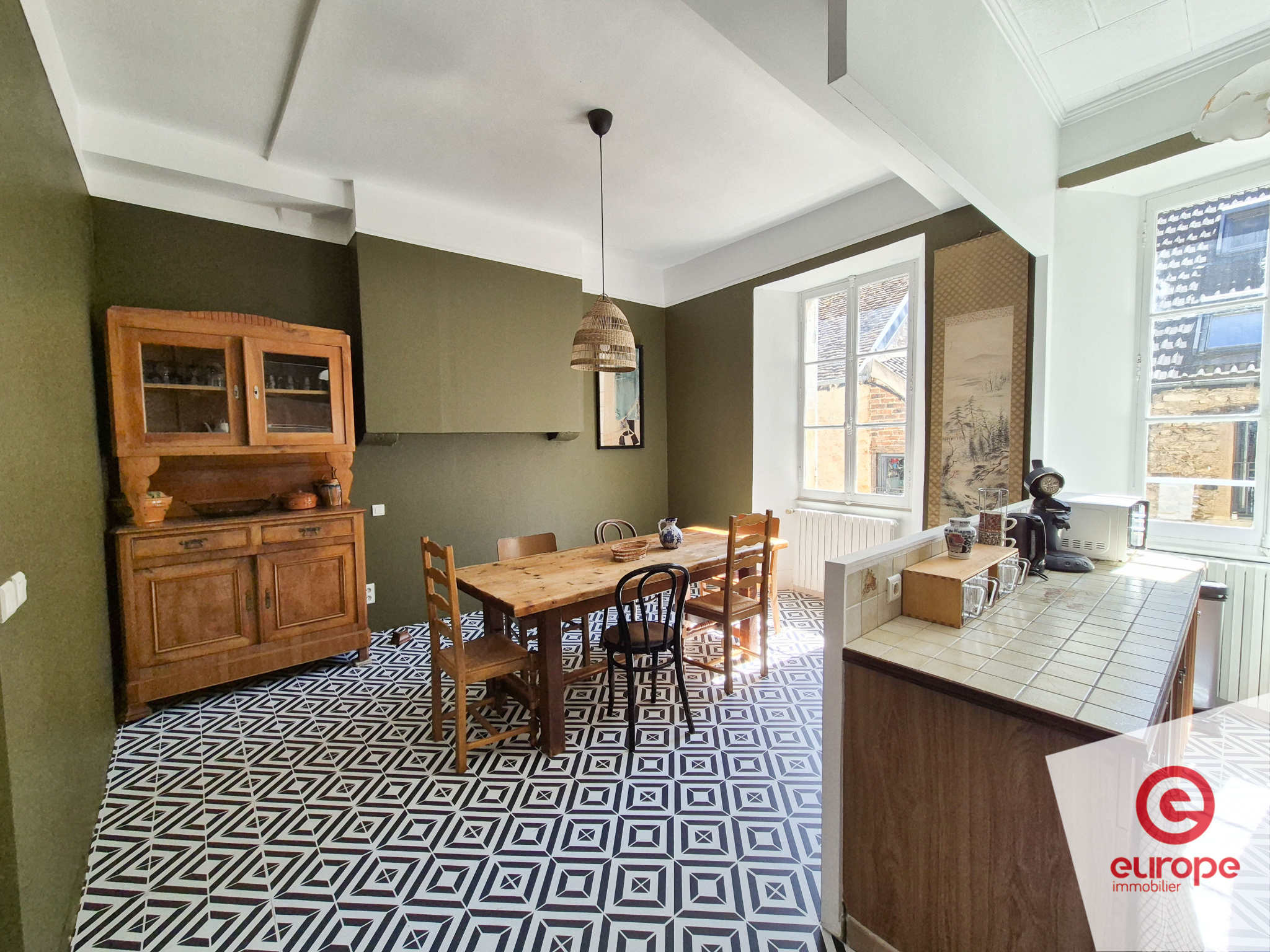 Au premier étage, un palier dessert une salle à manger ouverte sur la cuisine, totalisant 26 m², un WC indépendant, ainsi qu’un spacieux séjour de 30 m² baigné de lumière, offrant une vue sur le marché couvert d’Avallon et un accès direct à une terrasse de 15 m². Une salle d’eau de 6 m² complète ce niveau.